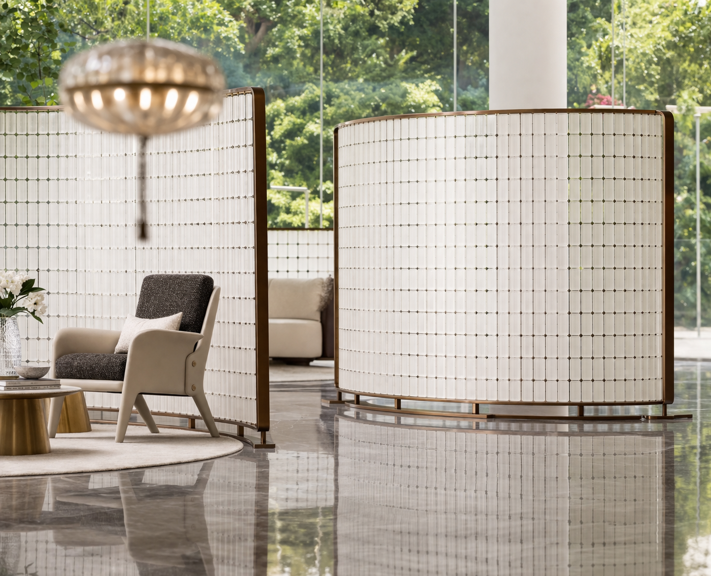 A contemporary interior partition with a smooth curved silhouette, crafted in a metal frame with infill made of frosted glass modules. The semi-transparent structure gently defines space while allowing light to pass through, creating depth and a soft visual rhythm.